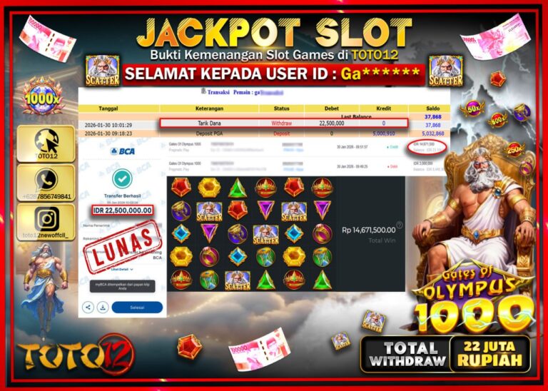 Selamat kepada Member Kami Ga****** Telah Jackpot dan berhasil mendapatkan kemenangan besar pada permainan JACKPOT SLOT GAME (GATES OF OLYMPUS 1000) Dengan Kemenangan Sebesar Rp.22.500.000 –. Setelah mengisi Fomulir Withdraw dengan Kurang waktu 1-2 Menit Dana sudah kami Trasnfer kepada Pemilik Userid dan dana sudah dapat di cairkan oleh pemenang. Bukti Pembayaran yang TOTO12 berikan merupakan…