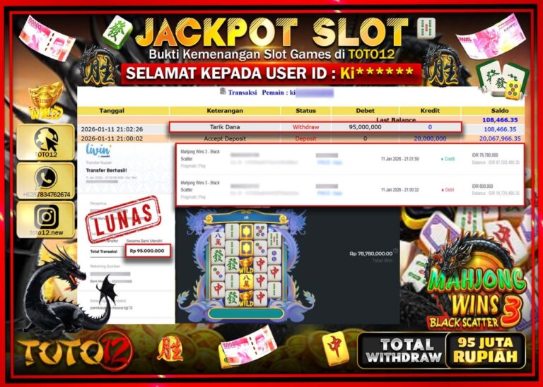Selamat kepada Member Kami Ki****** Telah Jackpot dan berhasil mendapatkan kemenangan besar pada permainan JACKPOT SLOT GAME (MAHJONG WINS 3 BLACK SCATTER) Dengan Kemenangan Sebesar Rp.95.000.000 –. Setelah mengisi Fomulir Withdraw dengan Kurang waktu 1-2 Menit Dana sudah kami Trasnfer kepada Pemilik Userid dan dana sudah dapat di cairkan oleh pemenang. Bukti Pembayaran yang TOTO12 berikan…