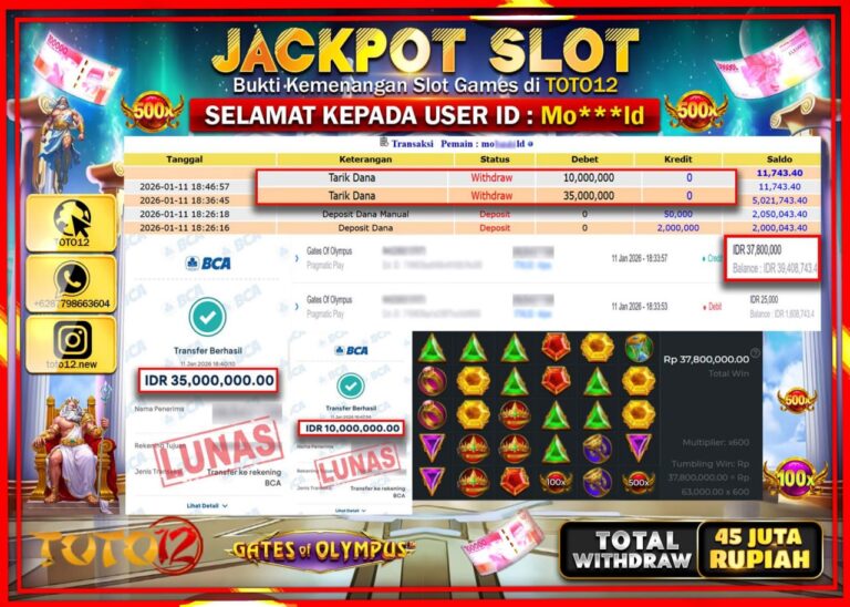 Selamat kepada Member Kami Mo****** Telah Jackpot dan berhasil mendapatkan kemenangan besar pada permainan JACKPOT SLOT GAME (GATES OF OLYMPUS) Dengan Kemenangan Sebesar Rp.45.000.000 –. Setelah mengisi Fomulir Withdraw dengan Kurang waktu 1-2 Menit Dana sudah kami Trasnfer kepada Pemilik Userid dan dana sudah dapat di cairkan oleh pemenang. Bukti Pembayaran yang TOTO12 berikan merupakan Bukti…
