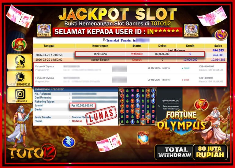 Selamat kepada Member Kami iN**** Telah Jackpot dan berhasil mendapatkan kemenangan besar pada permainan JACKPOT SLOT GAME (FORTUNE OF OLYMPUS) Dengan Kemenangan Sebesar Rp.80.000.000–. Setelah mengisi Fomulir Withdraw dengan Kurang waktu 1-2 Menit Dana sudah kami Trasnfer kepada Pemilik Userid dan dana sudah dapat di cairkan oleh pemenang. Bukti Pembayaran yang TOTO12 berikan merupakan Bukti Pembayaran…