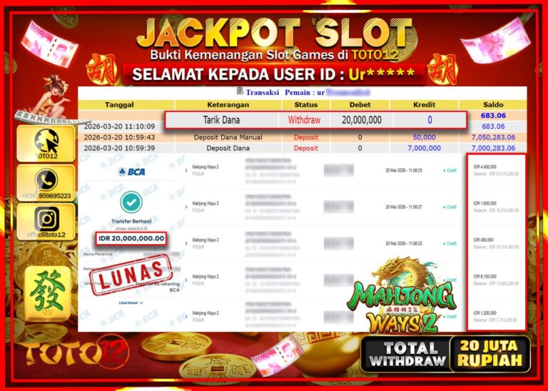 Selamat kepada Member Kami Ur**** Telah Jackpot dan berhasil mendapatkan kemenangan besar pada permainan JACKPOT SLOT GAME (MAHJONG WAYS 2) Dengan Kemenangan Sebesar Rp.20.000.000–. Setelah mengisi Fomulir Withdraw dengan Kurang waktu 1-2 Menit Dana sudah kami Trasnfer kepada Pemilik Userid dan dana sudah dapat di cairkan oleh pemenang. Bukti Pembayaran yang TOTO12 berikan merupakan Bukti Pembayaran…