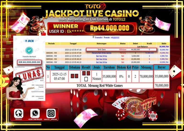 Selamat kepada Member Kami Ek****** Telah Jackpot dan berhasil mendapatkan kemenangan besar pada permainan JACKPOT LIVE CASINO (RED WHITE) Dengan Kemenangan Sebesar Rp.44.000.000 –. Setelah mengisi Fomulir Withdraw dengan Kurang waktu 1-2 Menit Dana sudah kami Trasnfer kepada Pemilik Userid dan dana sudah dapat di cairkan oleh pemenang. Bukti Pembayaran yang TOTO12 berikan merupakan Bukti Pembayaran…