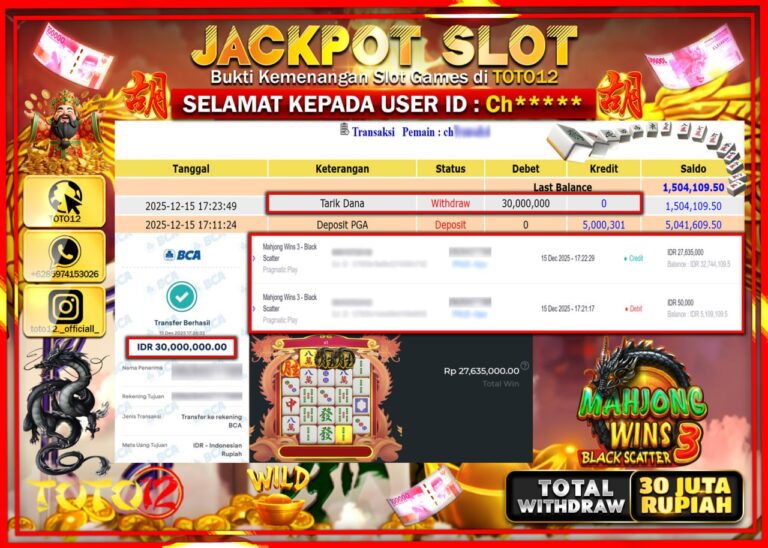 Selamat kepada Member Kami Ch****** Telah Jackpot dan berhasil mendapatkan kemenangan besar pada permainan JACKPOT SLOT GAME (MAHJONG WINS 3 BLACK SCATTER) Dengan Kemenangan Sebesar Rp.30.000.000 –. Setelah mengisi Fomulir Withdraw dengan Kurang waktu 1-2 Menit Dana sudah kami Trasnfer kepada Pemilik Userid dan dana sudah dapat di cairkan oleh pemenang. Bukti Pembayaran yang TOTO12 berikan…