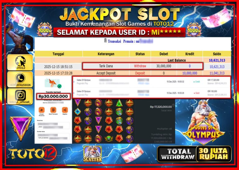 Selamat kepada Member Kami Mi****** Telah Jackpot dan berhasil mendapatkan kemenangan besar pada permainan JACKPOT SLOT GAME (GATES OF OLYMPUS) Dengan Kemenangan Sebesar Rp.30.000.000 –. Setelah mengisi Fomulir Withdraw dengan Kurang waktu 1-2 Menit Dana sudah kami Trasnfer kepada Pemilik Userid dan dana sudah dapat di cairkan oleh pemenang. Bukti Pembayaran yang TOTO12 berikan merupakan Bukti…