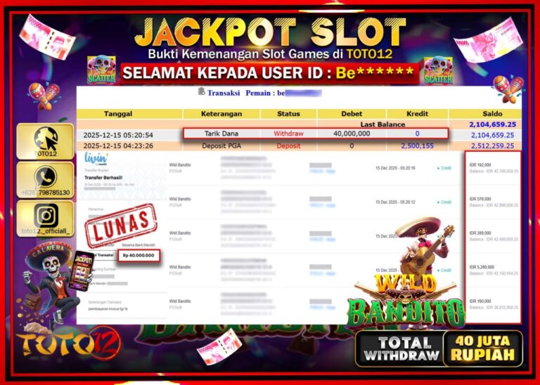 Selamat kepada Member Kami Be****** Telah Jackpot dan berhasil mendapatkan kemenangan besar pada permainan JACKPOT SLOT GAME (WILD BANDITO) Dengan Kemenangan Sebesar Rp.40.000.000 –. Setelah mengisi Fomulir Withdraw dengan Kurang waktu 1-2 Menit Dana sudah kami Trasnfer kepada Pemilik Userid dan dana sudah dapat di cairkan oleh pemenang. Bukti Pembayaran yang TOTO12 berikan merupakan Bukti Pembayaran…