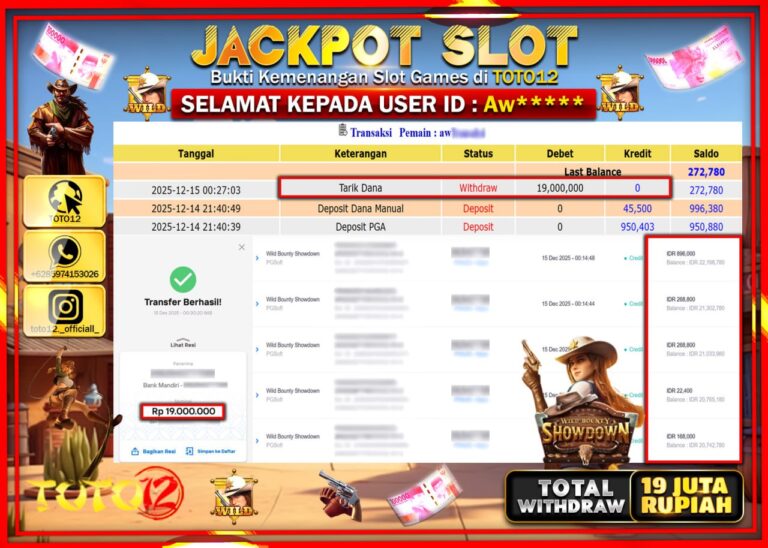 Selamat kepada Member Kami Aw****** Telah Jackpot dan berhasil mendapatkan kemenangan besar pada permainan JACKPOT SLOT GAME (WILD BOUNTY SHOWDOWN) Dengan Kemenangan Sebesar Rp.19.000.000 –. Setelah mengisi Fomulir Withdraw dengan Kurang waktu 1-2 Menit Dana sudah kami Trasnfer kepada Pemilik Userid dan dana sudah dapat di cairkan oleh pemenang. Bukti Pembayaran yang TOTO12 berikan merupakan Bukti…