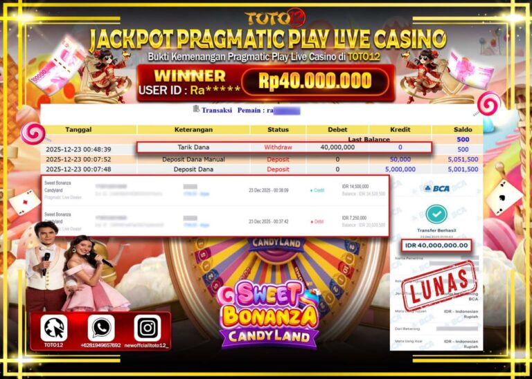 Selamat kepada Member Kami Ra****** Telah Jackpot dan berhasil mendapatkan kemenangan besar pada permainan JACKPOT PRAGMATIC PLAY LIVE CASINO (SWEET BONANZA CANDY LAND) Dengan Kemenangan Sebesar Rp.40.000.000 –. Setelah mengisi Fomulir Withdraw dengan Kurang waktu 1-2 Menit Dana sudah kami Trasnfer kepada Pemilik Userid dan dana sudah dapat di cairkan oleh pemenang. Bukti Pembayaran yang TOTO12…