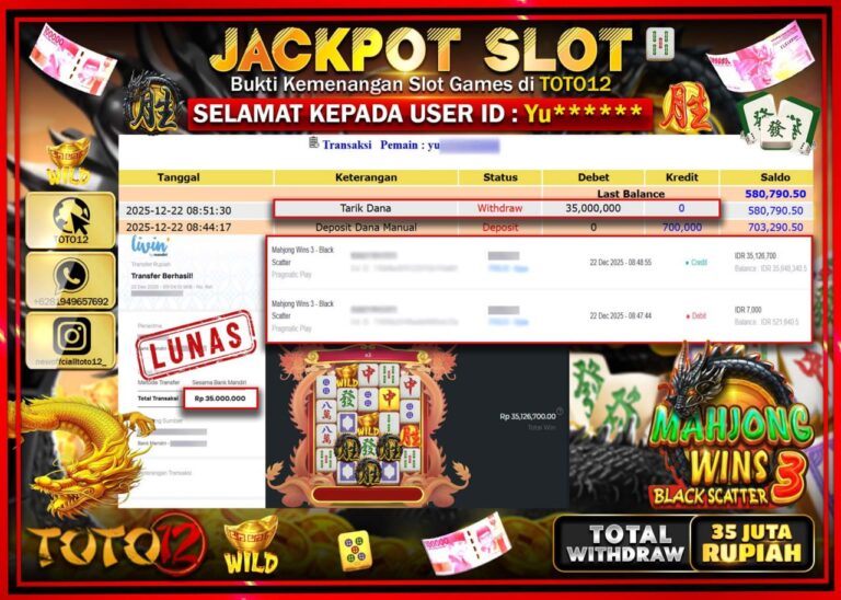 Selamat kepada Member Kami Yu****** Telah Jackpot dan berhasil mendapatkan kemenangan besar pada permainan JACKPOT SLOT GAME (MAHJONG WINS 3 BLACK SCATTER) Dengan Kemenangan Sebesar Rp.35.000.000 –. Setelah mengisi Fomulir Withdraw dengan Kurang waktu 1-2 Menit Dana sudah kami Trasnfer kepada Pemilik Userid dan dana sudah dapat di cairkan oleh pemenang. Bukti Pembayaran yang TOTO12 berikan…