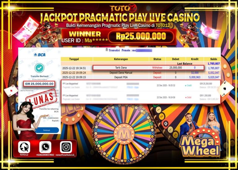 Selamat kepada Member Kami Ma****** Telah Jackpot dan berhasil mendapatkan kemenangan besar pada permainan JACKPOT PRAGMATIC PLAY LIVE CASINO (MEGA WHEEL) Dengan Kemenangan Sebesar Rp.25.000.000 –. Setelah mengisi Fomulir Withdraw dengan Kurang waktu 1-2 Menit Dana sudah kami Trasnfer kepada Pemilik Userid dan dana sudah dapat di cairkan oleh pemenang. Bukti Pembayaran yang TOTO12 berikan merupakan…