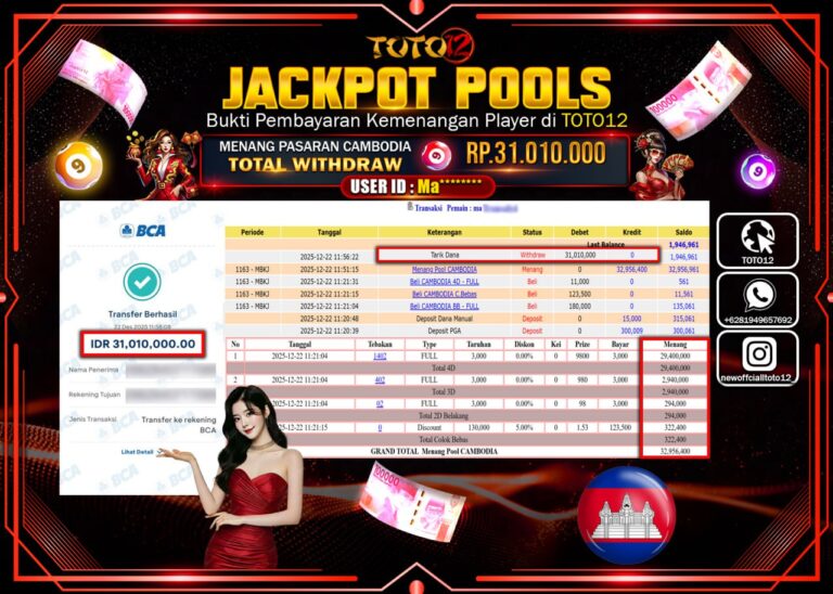 Selamat kepada Member Kami Ma****** Telah Jackpot dan berhasil mendapatkan kemenangan besar pada permainan JACKPOT POOLS PASARAN (CAMBODIA) Dengan Kemenangan Sebesar Rp.31.010.000 –. Setelah mengisi Fomulir Withdraw dengan Kurang waktu 1-2 Menit Dana sudah kami Trasnfer kepada Pemilik Userid dan dana sudah dapat di cairkan oleh pemenang. Bukti Pembayaran yang TOTO12 berikan merupakan Bukti Pembayaran yang SAH…