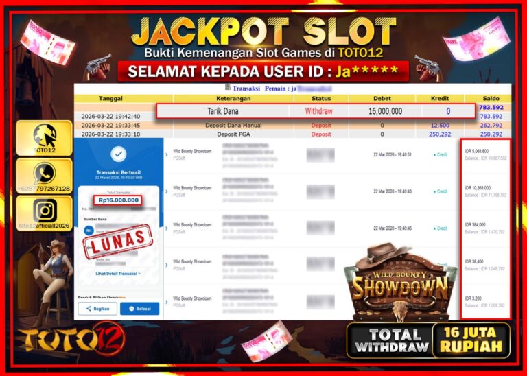 Selamat kepada Member Kami Ja**** Telah Jackpot dan berhasil mendapatkan kemenangan besar pada permainan JACKPOT SLOT GAME (WILD BOUNTY SHOWDOWN) Dengan Kemenangan Sebesar Rp.16.000.000. Setelah mengisi Fomulir Withdraw dengan Kurang waktu 1-2 Menit Dana sudah kami Trasnfer kepada Pemilik Userid dan dana sudah dapat di cairkan oleh pemenang. Bukti Pembayaran yang TOTO12 berikan merupakan Bukti Pembayaran…