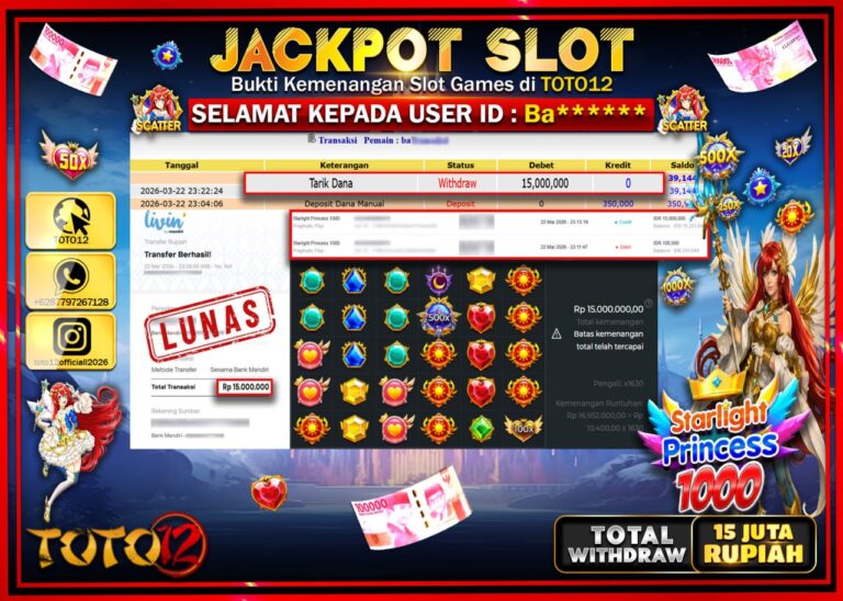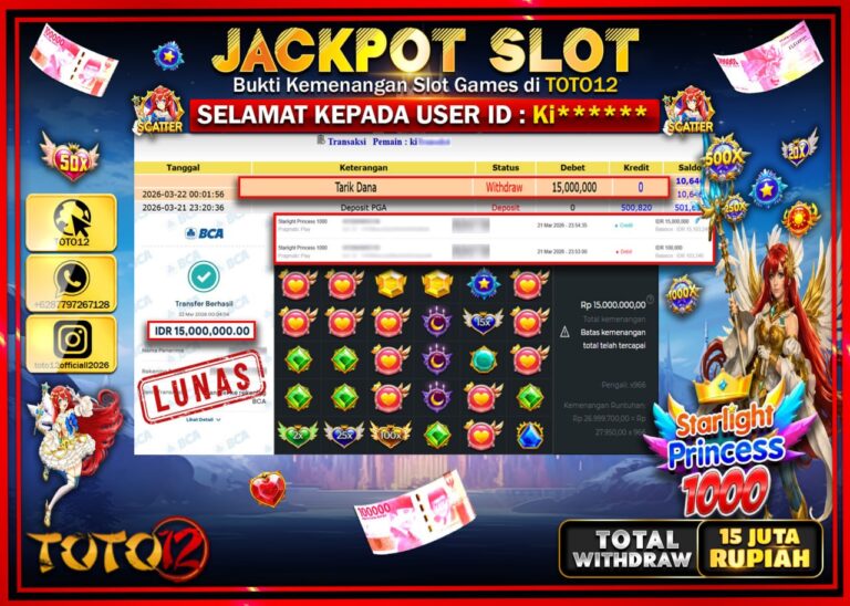 Selamat kepada Member Kami Ki**** Telah Jackpot dan berhasil mendapatkan kemenangan besar pada permainan JACKPOT SLOT GAME (STARLIGHT PRINCESS 1000) Dengan Kemenangan Sebesar Rp.15.000.000–. Setelah mengisi Fomulir Withdraw dengan Kurang waktu 1-2 Menit Dana sudah kami Trasnfer kepada Pemilik Userid dan dana sudah dapat di cairkan oleh pemenang. Bukti Pembayaran yang TOTO12 berikan merupakan Bukti Pembayaran…