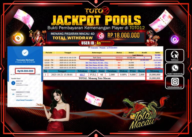 Selamat kepada Member Kami As****** Telah Jackpot dan berhasil mendapatkan kemenangan besar pada permainan JACKPOT POOLS PASARAN (MACAU 4D) Dengan Kemenangan Sebesar Rp.18.000.000 –. Setelah mengisi Fomulir Withdraw dengan Kurang waktu 1-2 Menit Dana sudah kami Trasnfer kepada Pemilik Userid dan dana sudah dapat di cairkan oleh pemenang. Bukti Pembayaran yang TOTO12 berikan merupakan Bukti Pembayaran…