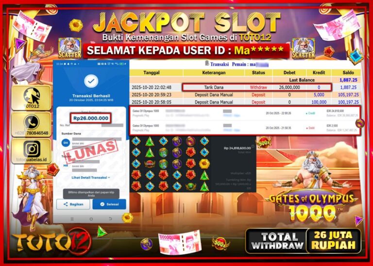 Selamat kepada Member Kami Ma****** Telah Jackpot dan berhasil mendapatkan kemenangan besar pada permainan JACKPOT SLOT GAME (GATES OF OLYMPUS 1000) Dengan Kemenangan Sebesar Rp.26.000.000 –. Setelah mengisi Fomulir Withdraw dengan Kurang waktu 1-2 Menit Dana sudah kami Trasnfer kepada Pemilik Userid dan dana sudah dapat di cairkan oleh pemenang. Bukti Pembayaran yang TOTO12 berikan merupakan…