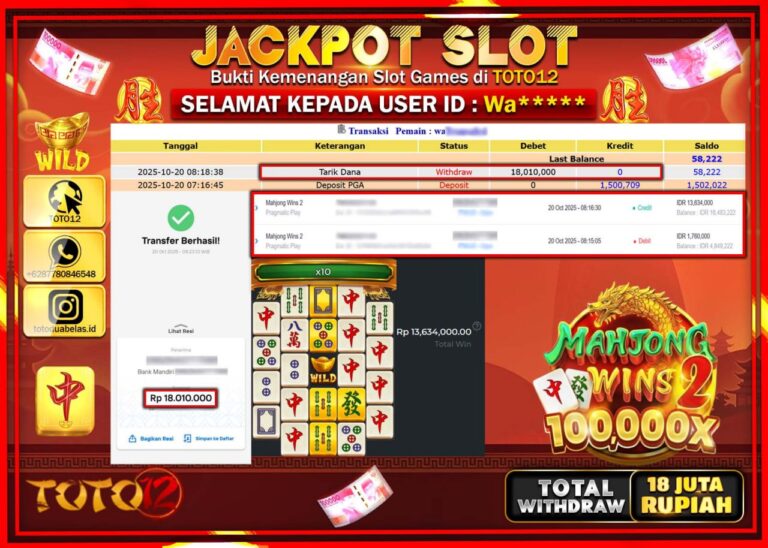 Selamat kepada Member Kami Wa****** Telah Jackpot dan berhasil mendapatkan kemenangan besar pada permainan JACKPOT SLOT GAME (MAHJONG WINS 2) Dengan Kemenangan Sebesar Rp.18.010.000 –. Setelah mengisi Fomulir Withdraw dengan Kurang waktu 1-2 Menit Dana sudah kami Trasnfer kepada Pemilik Userid dan dana sudah dapat di cairkan oleh pemenang. Bukti Pembayaran yang TOTO12 berikan merupakan Bukti…