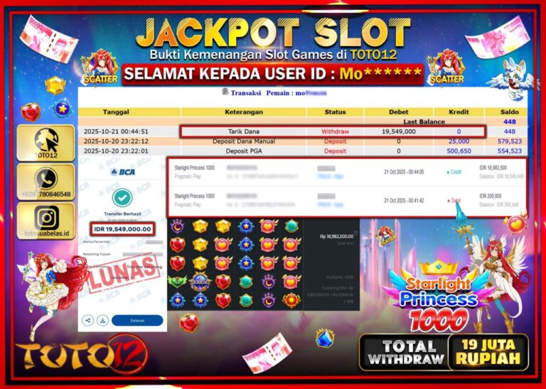 Selamat kepada Member Kami Mo****** Telah Jackpot dan berhasil mendapatkan kemenangan besar pada permainan JACKPOT SLOT GAME (STARLIGHT PRINCESS 1000) Dengan Kemenangan Sebesar Rp.19.549.000 –. Setelah mengisi Fomulir Withdraw dengan Kurang waktu 1-2 Menit Dana sudah kami Trasnfer kepada Pemilik Userid dan dana sudah dapat di cairkan oleh pemenang. Bukti Pembayaran yang TOTO12 berikan merupakan Bukti…