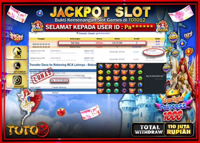 Selamat kepada Member Kami Pa****** Telah Jackpot dan berhasil mendapatkan kemenangan besar pada permainan JACKPOT SLOT GAME (STARLIGHT PRINCESS 1000) Dengan Kemenangan Sebesar Rp.110.737.000 –. Setelah mengisi Fomulir Withdraw dengan Kurang waktu 1-2 Menit Dana sudah kami Trasnfer kepada Pemilik Userid dan dana sudah dapat di cairkan oleh pemenang. Bukti Pembayaran yang TOTO12 berikan merupakan Bukti…