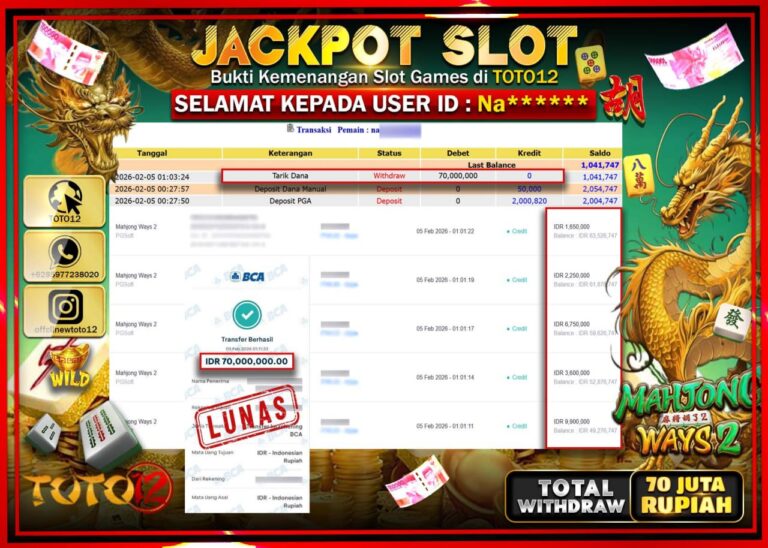 Selamat kepada Member Kami Na****** Telah Jackpot dan berhasil mendapatkan kemenangan besar pada permainan JACKPOT SLOT GAME (MAHJONG WAYS 2) Dengan Kemenangan Sebesar Rp.70.000.000 –. Setelah mengisi Fomulir Withdraw dengan Kurang waktu 1-2 Menit Dana sudah kami Trasnfer kepada Pemilik Userid dan dana sudah dapat di cairkan oleh pemenang. Bukti Pembayaran yang TOTO12 berikan merupakan Bukti…