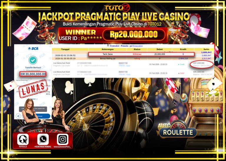HANYA DI TOTO12 JP PASTI DI BAYAR LUNAS DAN CEPAT!!!!!! JACKPOT PRAGMATIC PLAY LIVE CASINO (MANIA AUTO ROLET) Rp.20.000.000 !!!!