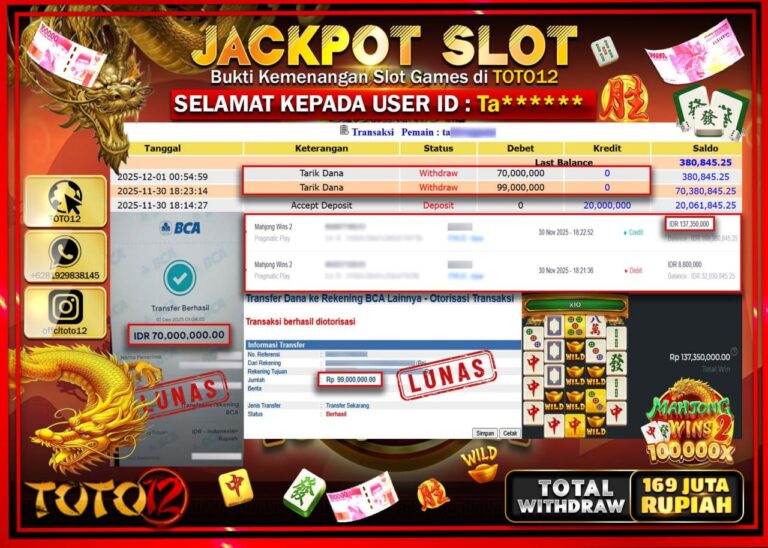 Selamat kepada Member Kami Ta****** Telah Jackpot dan berhasil mendapatkan kemenangan besar pada permainan JACKPOT SLOT GAME (MAHJONG WINS 2) Dengan Kemenangan Sebesar Rp.169.000.000 –. Setelah mengisi Fomulir Withdraw dengan Kurang waktu 1-2 Menit Dana sudah kami Trasnfer kepada Pemilik Userid dan dana sudah dapat di cairkan oleh pemenang. Bukti Pembayaran yang TOTO12 berikan merupakan Bukti…