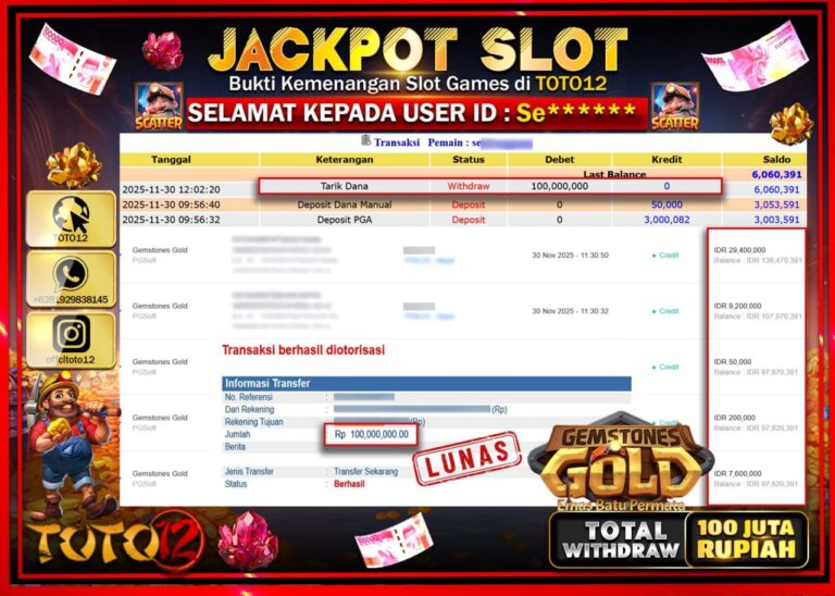 Selamat kepada Member Kami Se****** Telah Jackpot dan berhasil mendapatkan kemenangan besar pada permainan JACKPOT SLOT GAME (GEMSTONES GOLD) Dengan Kemenangan Sebesar Rp.100.000.000 –. Setelah mengisi Fomulir Withdraw dengan Kurang waktu 1-2 Menit Dana sudah kami Trasnfer kepada Pemilik Userid dan dana sudah dapat di cairkan oleh pemenang. Bukti Pembayaran yang TOTO12 berikan merupakan Bukti Pembayaran…