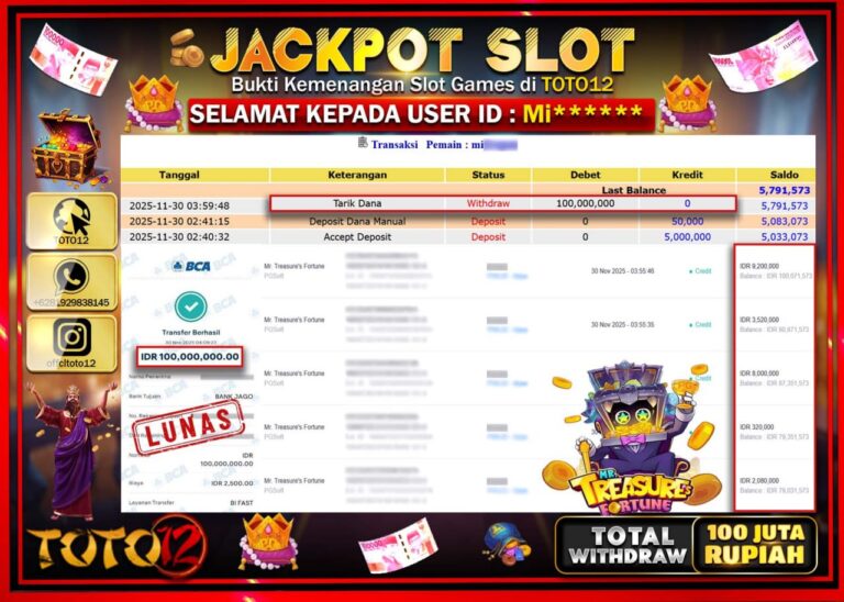 Selamat kepada Member Kami Mi****** Telah Jackpot dan berhasil mendapatkan kemenangan besar pada permainan JACKPOT SLOT GAME (MR TREASURE FORTUNE) Dengan Kemenangan Sebesar Rp.100.000.000 –. Setelah mengisi Fomulir Withdraw dengan Kurang waktu 1-2 Menit Dana sudah kami Trasnfer kepada Pemilik Userid dan dana sudah dapat di cairkan oleh pemenang. Bukti Pembayaran yang TOTO12 berikan merupakan Bukti…