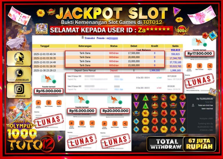 Selamat kepada Member Kami De****** Telah Jackpot dan berhasil mendapatkan kemenangan besar pada permainan JACKPOT SLOT GAME (WILD BOUNTY SHOWDOWN) Dengan Kemenangan Sebesar Rp.36.000.000 –. Setelah mengisi Fomulir Withdraw dengan Kurang waktu 1-2 Menit Dana sudah kami Trasnfer kepada Pemilik Userid dan dana sudah dapat di cairkan oleh pemenang. Bukti Pembayaran yang TOTO12 berikan merupakan Bukti…