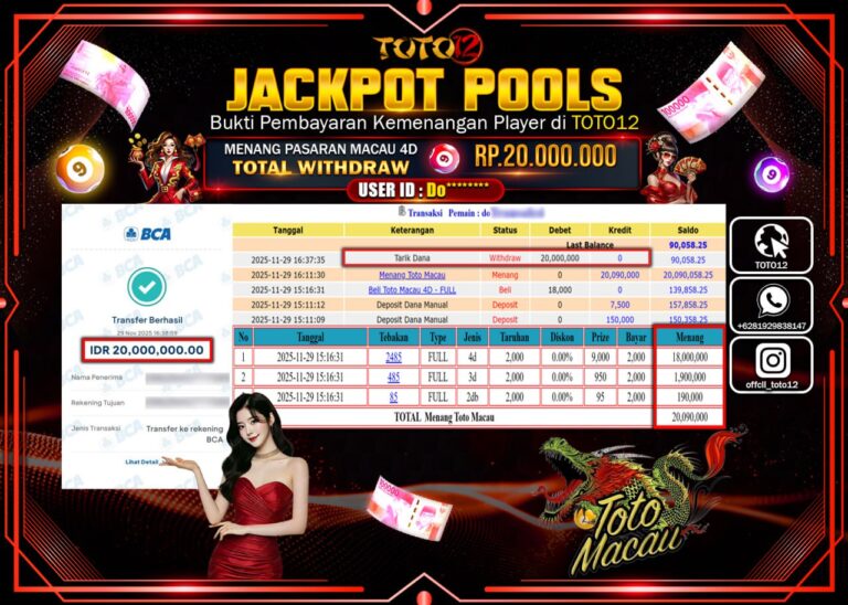Selamat kepada Member Kami Do****** Telah Jackpot dan berhasil mendapatkan kemenangan besar pada permainan JACKPOT POOLS PASARAN (MACAU 4D) Dengan Kemenangan Sebesar Rp.20.000.000 –. Setelah mengisi Fomulir Withdraw dengan Kurang waktu 1-2 Menit Dana sudah kami Trasnfer kepada Pemilik Userid dan dana sudah dapat di cairkan oleh pemenang. Bukti Pembayaran yang TOTO12 berikan merupakan Bukti Pembayaran…