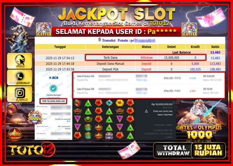 Selamat kepada Member Kami Pa****** Telah Jackpot dan berhasil mendapatkan kemenangan besar pada permainan JACKPOT SLOT GAME (GATES OF OLYMPUS SUPER SCATTER) Dengan Kemenangan Sebesar Rp.500.000.000 –. Setelah mengisi Fomulir Withdraw dengan Kurang waktu 1-2 Menit Dana sudah kami Trasnfer kepada Pemilik Userid dan dana sudah dapat di cairkan oleh pemenang. Bukti Pembayaran yang TOTO12 berikan…