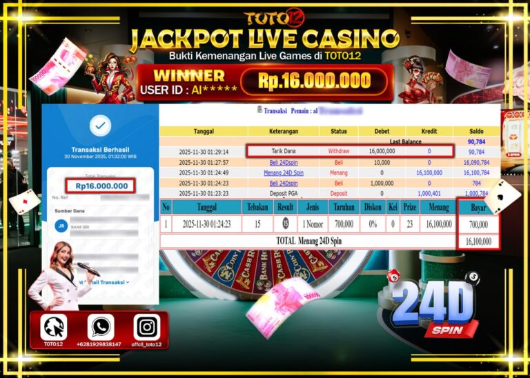 Selamat kepada Member Kami Al****** Telah Jackpot dan berhasil mendapatkan kemenangan besar pada permainan JACKPOT LIVE CASINO (24D SPIN) Dengan Kemenangan Sebesar Rp.16.000.000 –. Setelah mengisi Fomulir Withdraw dengan Kurang waktu 1-2 Menit Dana sudah kami Trasnfer kepada Pemilik Userid dan dana sudah dapat di cairkan oleh pemenang. Bukti Pembayaran yang TOTO12 berikan merupakan Bukti Pembayaran…