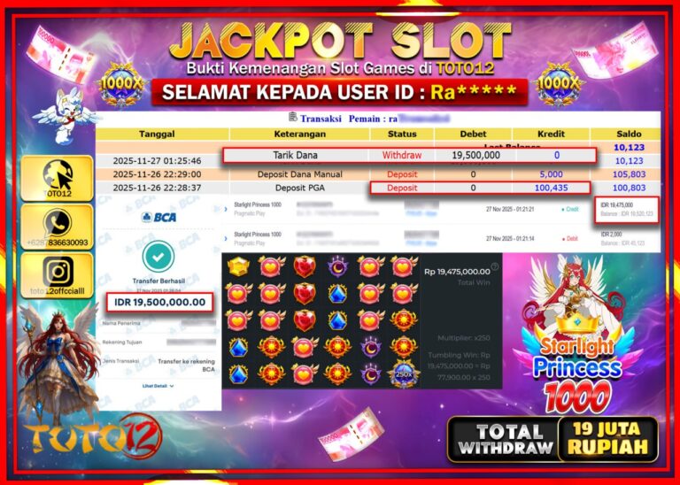 Selamat kepada Member Kami Ra****** Telah Jackpot dan berhasil mendapatkan kemenangan besar pada permainan JACKPOT SLOT GAME (STARLIGHT PRINCESS 1000) Dengan Kemenangan Sebesar Rp.19.500.000 –. Setelah mengisi Fomulir Withdraw dengan Kurang waktu 1-2 Menit Dana sudah kami Trasnfer kepada Pemilik Userid dan dana sudah dapat di cairkan oleh pemenang. Bukti Pembayaran yang TOTO12 berikan merupakan Bukti…