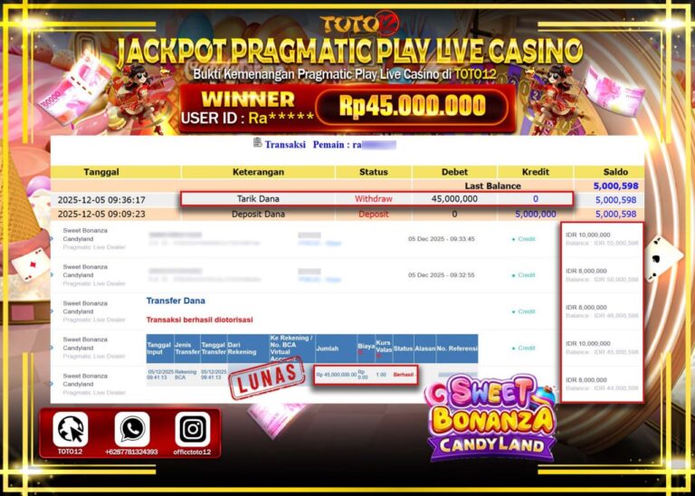 Selamat kepada Member Kami Ra****** Telah Jackpot dan berhasil mendapatkan kemenangan besar pada permainan JACKPOT PRAGMATIC PLAY LIVE CASINO (SWEET BONANZA CANDYLAND) Dengan Kemenangan Sebesar Rp.45.000.000 –. Setelah mengisi Fomulir Withdraw dengan Kurang waktu 1-2 Menit Dana sudah kami Trasnfer kepada Pemilik Userid dan dana sudah dapat di cairkan oleh pemenang. Bukti Pembayaran yang TOTO12 berikan…