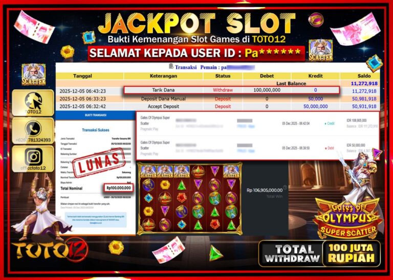 Selamat kepada Member Kami Pa****** Telah Jackpot dan berhasil mendapatkan kemenangan besar pada permainan JACKPOT SLOT GAME (GATES OF OLYMPUS SUPER SCATTER) Dengan Kemenangan Sebesar Rp.100.000.000 –. Setelah mengisi Fomulir Withdraw dengan Kurang waktu 1-2 Menit Dana sudah kami Trasnfer kepada Pemilik Userid dan dana sudah dapat di cairkan oleh pemenang. Bukti Pembayaran yang TOTO12 berikan…