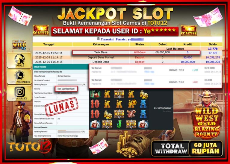 Selamat kepada Member Kami Ye****** Telah Jackpot dan berhasil mendapatkan kemenangan besar pada permainan JACKPOT SLOT GAME (WILD WEST GOLD) Dengan Kemenangan Sebesar Rp.60.000.000 –. Setelah mengisi Fomulir Withdraw dengan Kurang waktu 1-2 Menit Dana sudah kami Trasnfer kepada Pemilik Userid dan dana sudah dapat di cairkan oleh pemenang. Bukti Pembayaran yang TOTO12 berikan merupakan Bukti…