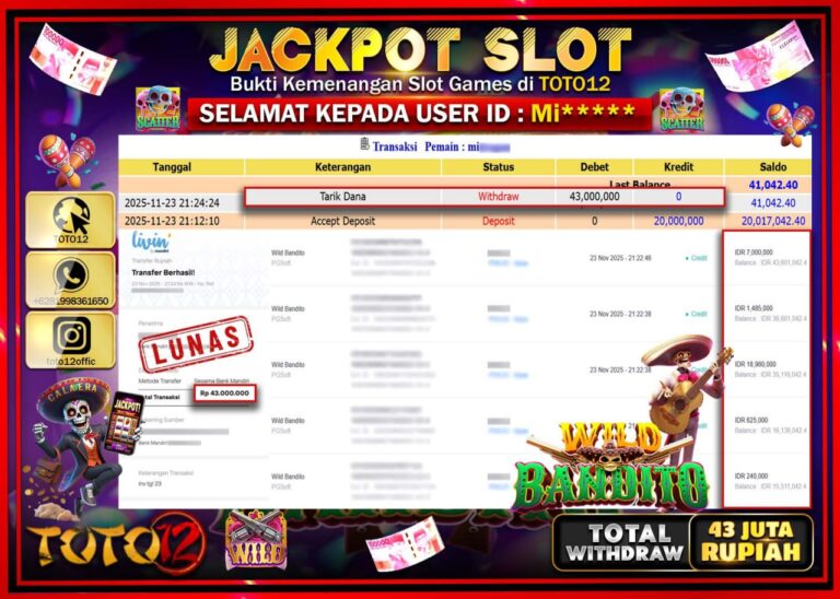 Selamat kepada Member Kami Mi****** Telah Jackpot dan berhasil mendapatkan kemenangan besar pada permainan JACKPOT SLOT GAME (WILD BANDITO) Dengan Kemenangan Sebesar Rp.43.000.000 –. Setelah mengisi Fomulir Withdraw dengan Kurang waktu 1-2 Menit Dana sudah kami Trasnfer kepada Pemilik Userid dan dana sudah dapat di cairkan oleh pemenang. Bukti Pembayaran yang TOTO12 berikan merupakan Bukti Pembayaran…