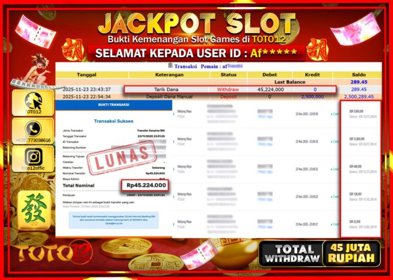 Selamat kepada Member Kami Af****** Telah Jackpot dan berhasil mendapatkan kemenangan besar pada permainan JACKPOT SLOT GAME (MAHJONG WAYS) Dengan Kemenangan Sebesar Rp.45.224.000 –. Setelah mengisi Fomulir Withdraw dengan Kurang waktu 1-2 Menit Dana sudah kami Trasnfer kepada Pemilik Userid dan dana sudah dapat di cairkan oleh pemenang. Bukti Pembayaran yang TOTO12 berikan merupakan Bukti Pembayaran…