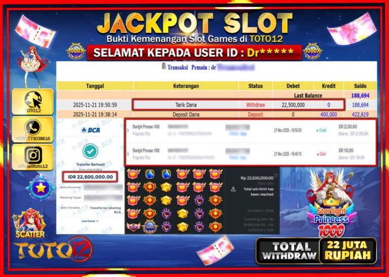 Selamat kepada Member Kami Dr****** Telah Jackpot dan berhasil mendapatkan kemenangan besar pada permainan JACKPOT SLOT GAME (STARLIGHT PRINCESS 1000) Dengan Kemenangan Sebesar Rp.22.500.000 –. Setelah mengisi Fomulir Withdraw dengan Kurang waktu 1-2 Menit Dana sudah kami Trasnfer kepada Pemilik Userid dan dana sudah dapat di cairkan oleh pemenang. Bukti Pembayaran yang TOTO12 berikan merupakan Bukti…