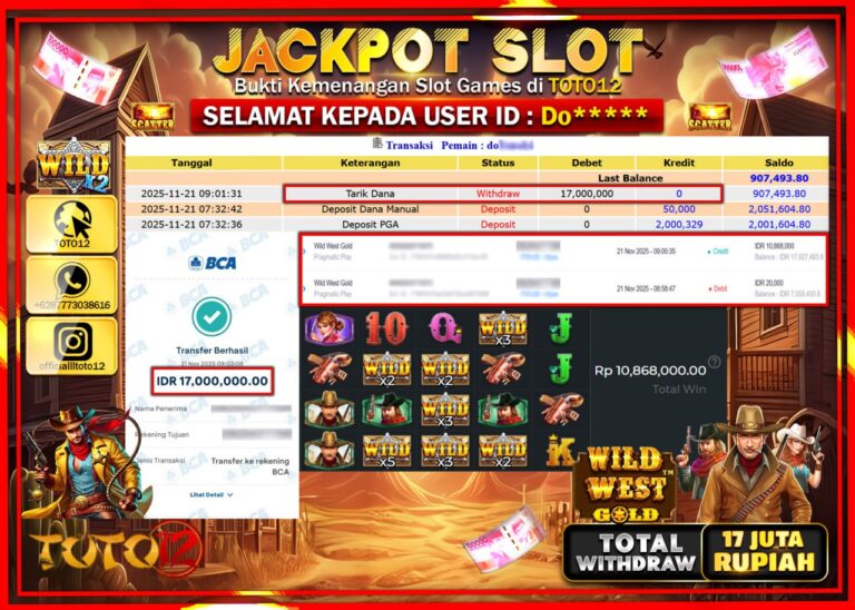 Selamat kepada Member Kami Do****** Telah Jackpot dan berhasil mendapatkan kemenangan besar pada permainan JACKPOT SLOT GAME (WILD WEST GOLD) Dengan Kemenangan Sebesar Rp.17.000.000 –. Setelah mengisi Fomulir Withdraw dengan Kurang waktu 1-2 Menit Dana sudah kami Trasnfer kepada Pemilik Userid dan dana sudah dapat di cairkan oleh pemenang. Bukti Pembayaran yang TOTO12 berikan merupakan Bukti…