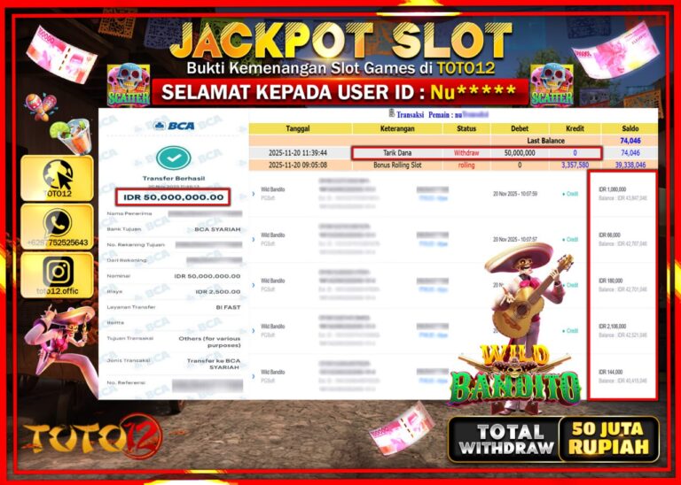 Selamat kepada Member Kami Nu****** Telah Jackpot dan berhasil mendapatkan kemenangan besar pada permainan JACKPOT SLOT GAME (WILD BANDITO) Dengan Kemenangan Sebesar Rp.50.000.000 –. Setelah mengisi Fomulir Withdraw dengan Kurang waktu 1-2 Menit Dana sudah kami Trasnfer kepada Pemilik Userid dan dana sudah dapat di cairkan oleh pemenang. Bukti Pembayaran yang TOTO12 berikan merupakan Bukti Pembayaran…