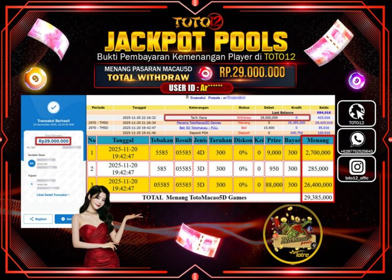 Selamat kepada Member Kami Ar****** Telah Jackpot dan berhasil mendapatkan kemenangan besar pada permainan JACKPOT POOLS PASARAN (MACAU 5D) Dengan Kemenangan Sebesar Rp.29.000.000 –. Setelah mengisi Fomulir Withdraw dengan Kurang waktu 1-2 Menit Dana sudah kami Trasnfer kepada Pemilik Userid dan dana sudah dapat di cairkan oleh pemenang. Bukti Pembayaran yang TOTO12 berikan merupakan Bukti Pembayaran…