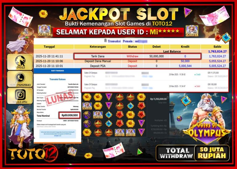Selamat kepada Member Kami Mi****** Telah Jackpot dan berhasil mendapatkan kemenangan besar pada permainan JACKPOT SLOT GAME (GATES OF OLYMPUS) Dengan Kemenangan Sebesar Rp.50.000.000 –. Setelah mengisi Fomulir Withdraw dengan Kurang waktu 1-2 Menit Dana sudah kami Trasnfer kepada Pemilik Userid dan dana sudah dapat di cairkan oleh pemenang. Bukti Pembayaran yang TOTO12 berikan merupakan Bukti…