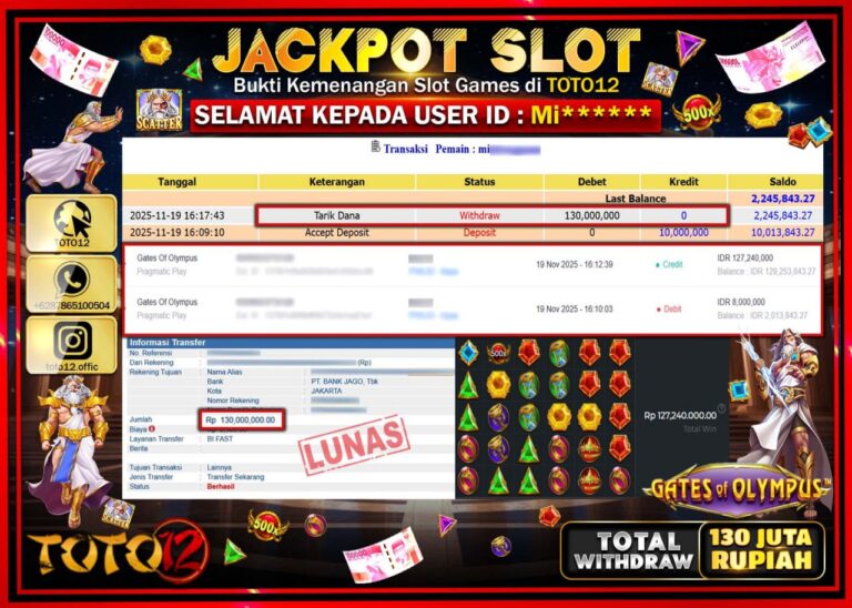 Selamat kepada Member Kami Mi****** Telah Jackpot dan berhasil mendapatkan kemenangan besar pada permainan JACKPOT SLOT GAME (GATES OF OLYMPUS) Dengan Kemenangan Sebesar Rp.130.000.000 –. Setelah mengisi Fomulir Withdraw dengan Kurang waktu 1-2 Menit Dana sudah kami Trasnfer kepada Pemilik Userid dan dana sudah dapat di cairkan oleh pemenang. Bukti Pembayaran yang TOTO12 berikan merupakan Bukti…
