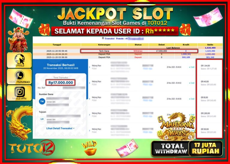 Selamat kepada Member Kami Rh****** Telah Jackpot dan berhasil mendapatkan kemenangan besar pada permainan JACKPOT SLOT GAME (MAHJONG WAYS) Dengan Kemenangan Sebesar Rp.17.000.000 –. Setelah mengisi Fomulir Withdraw dengan Kurang waktu 1-2 Menit Dana sudah kami Trasnfer kepada Pemilik Userid dan dana sudah dapat di cairkan oleh pemenang. Bukti Pembayaran yang TOTO12 berikan merupakan Bukti Pembayaran…