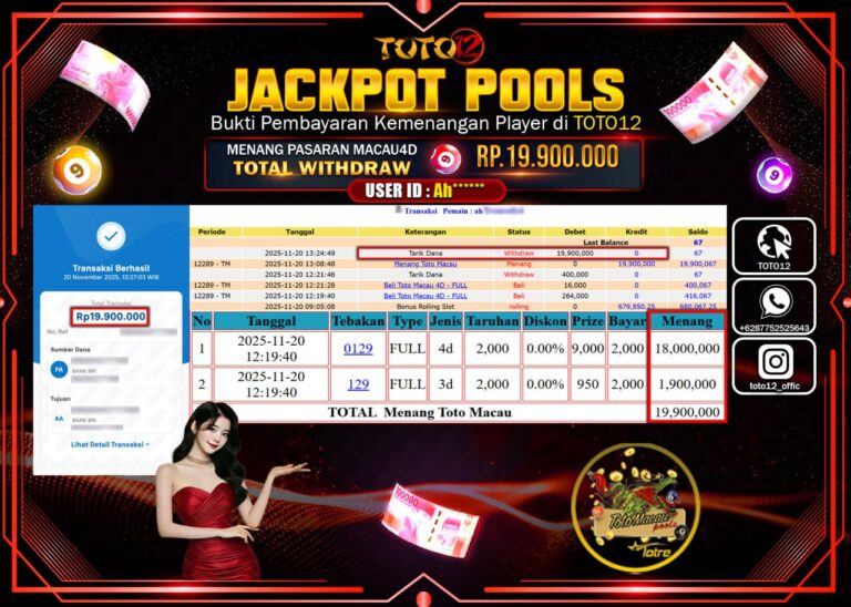 Selamat kepada Member Kami Ah****** Telah Jackpot dan berhasil mendapatkan kemenangan besar pada permainan JACKPOT POOLS PASARAN (MACAU 4D) Dengan Kemenangan Sebesar Rp.19.900.000 –. Setelah mengisi Fomulir Withdraw dengan Kurang waktu 1-2 Menit Dana sudah kami Trasnfer kepada Pemilik Userid dan dana sudah dapat di cairkan oleh pemenang. Bukti Pembayaran yang TOTO12 berikan merupakan Bukti Pembayaran…