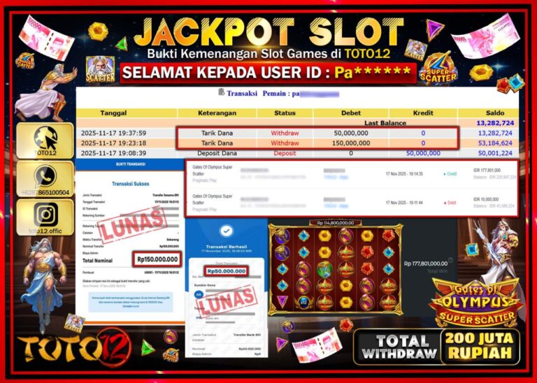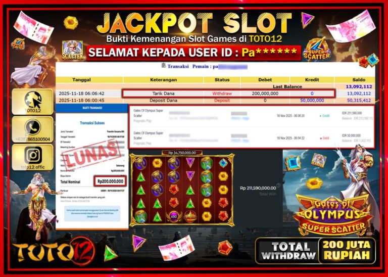 Selamat kepada Member Kami Pa****** Telah Jackpot dan berhasil mendapatkan kemenangan besar pada permainan JACKPOT SLOT GAME (GATES OF OLYMPUS SUPER SCATTER) Dengan Kemenangan Sebesar Rp.200.000.000 –. Setelah mengisi Fomulir Withdraw dengan Kurang waktu 1-2 Menit Dana sudah kami Trasnfer kepada Pemilik Userid dan dana sudah dapat di cairkan oleh pemenang. Bukti Pembayaran yang TOTO12 berikan…