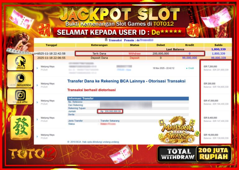 Selamat kepada Member Kami De****** Telah Jackpot dan berhasil mendapatkan kemenangan besar pada permainan JACKPOT SLOT GAME (MAHJONG WAYS) Dengan Kemenangan Sebesar Rp.200.000.000 –. Setelah mengisi Fomulir Withdraw dengan Kurang waktu 1-2 Menit Dana sudah kami Trasnfer kepada Pemilik Userid dan dana sudah dapat di cairkan oleh pemenang. Bukti Pembayaran yang TOTO12 berikan merupakan Bukti Pembayaran…