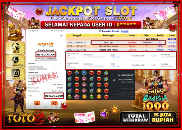 Selamat kepada Member Kami Il****** Telah Jackpot dan berhasil mendapatkan kemenangan besar pada permainan JACKPOT SLOT GAME (GATES OF GATOT KACA 1000) Dengan Kemenangan Sebesar Rp.15.000.000 –. Setelah mengisi Fomulir Withdraw dengan Kurang waktu 1-2 Menit Dana sudah kami Trasnfer kepada Pemilik Userid dan dana sudah dapat di cairkan oleh pemenang. Bukti Pembayaran yang TOTO12 berikan…
