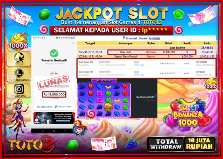 Selamat kepada Member Kami Ip****** Telah Jackpot dan berhasil mendapatkan kemenangan besar pada permainan JACKPOT SLOT GAME (SWEET BONANZA 1000) Dengan Kemenangan Sebesar Rp.18.000.000 –. Setelah mengisi Fomulir Withdraw dengan Kurang waktu 1-2 Menit Dana sudah kami Trasnfer kepada Pemilik Userid dan dana sudah dapat di cairkan oleh pemenang. Bukti Pembayaran yang TOTO12 berikan merupakan Bukti…