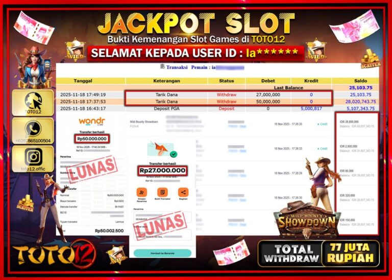 Selamat kepada Member Kami Ia****** Telah Jackpot dan berhasil mendapatkan kemenangan besar pada permainan JACKPOT SLOT GAME (WILD BOUNTY SHOWDOWN) Dengan Kemenangan Sebesar Rp.77.000.000 –. Setelah mengisi Fomulir Withdraw dengan Kurang waktu 1-2 Menit Dana sudah kami Trasnfer kepada Pemilik Userid dan dana sudah dapat di cairkan oleh pemenang. Bukti Pembayaran yang TOTO12 berikan merupakan Bukti…