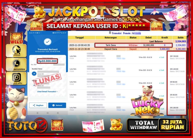 Selamat kepada Member Kami Ki****** Telah Jackpot dan berhasil mendapatkan kemenangan besar pada permainan JACKPOT SLOT GAME (LUCKY NEKO) Dengan Kemenangan Sebesar Rp.32.000.000 –. Setelah mengisi Fomulir Withdraw dengan Kurang waktu 1-2 Menit Dana sudah kami Trasnfer kepada Pemilik Userid dan dana sudah dapat di cairkan oleh pemenang. Bukti Pembayaran yang TOTO12 berikan merupakan Bukti Pembayaran…
